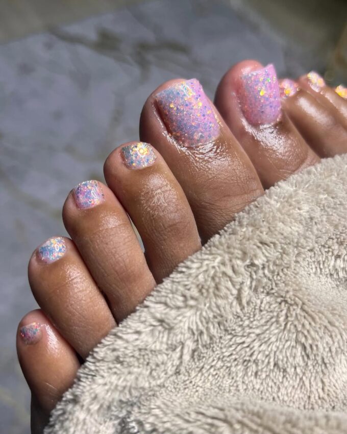 To wygląda jak pedicure, który ktoś wymyślił po zjedzeniu waty cukrowej i patrzeniu w niebo — totalnie pastelowy chaos, ale w najlepszym możliwym sensie. Bazą jest delikatny róż, taki niby spokojny, trochę mleczny, trochę jak poranna mgła… i nagle bam — holograficzne płatki, brokat, refleksy w każdym kierunku.